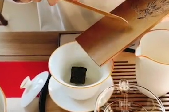 用茶匙取5克左右的砖茶,放入盖碗中,接着往盖碗中冲入煮开的沸水,第一泡洗茶,浸润10秒后需将茶水倒掉,将茶叶中的灰尘清除,以保证茶汤的洁净,然后将浸润后的砖茶放在一旁备用。