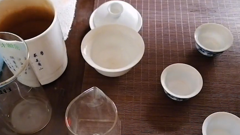 温洗茶具之后,取一块漳平水仙茶,不需将其掰碎,直接投入盖碗中即可,接着提起水壶往碗中倒入热水,浸润3-5秒后快速将水倒掉,此过程是为了洗茶,以去除水仙茶中的杂质和灰尘。