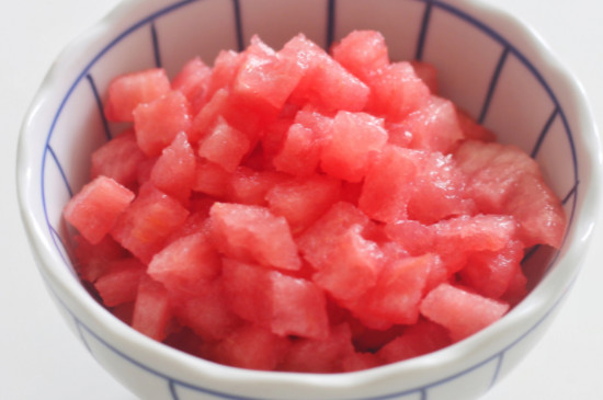 西瓜去皮切成小块,分为两份放置。也可以使用自己喜欢的水果,最好使用甜度高的水果,哈密瓜、橘子、苹果等水果常用来搭配果茶,切的过程中要注意水果块不要切太大。