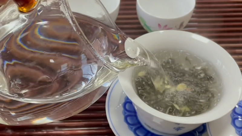 茉莉花茶包用适量热水冲泡三分钟,将冲泡好的茶汤放凉备用,冲泡时间不宜过长以免茶味过浓掩盖掉果味,茶包不一定选用茉莉花茶,其他茶类也可,也可以选用自己所喜欢的。