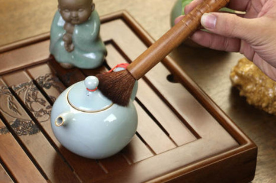 茶笔是养壶和清洁茶壶的工具,主要是用来吸附茶盘上多余的水分,以及将茶叶末刷干净等。