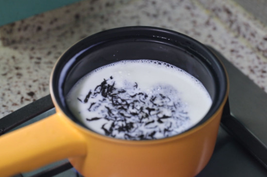 当茶叶炒到焦糖色之后,倒入准备好的牛奶,搅拌均匀,并添加适量的清水,避免奶茶过于甜腻,口感能更好。当牛奶煮沸之后,继续多煮1-2分钟,使茶叶的味道充分释放出来。