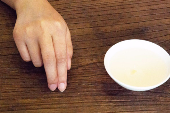 喝茶时扣手的礼仪手势为:1、晚辈对长辈,五指并拢成拳,拳心向下,连续敲击桌面三下;2、平辈之间,食指或者中指并拢,敲击桌面三下;3、长辈对晚辈,用食指或者中指敲击桌面一下。