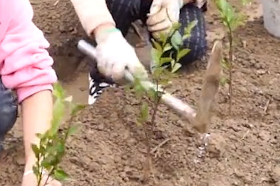 栽种茶树时,先在根部糊上泥土,然后按照行距1米、株距1.3米的间距进行栽种,种好之后将根部的土壤按压紧实,防止茶树出现歪倒的现象,然后浇一次透水,保证土壤的湿度,为茶树生长提供水分。