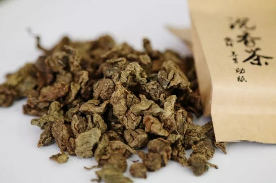 沉香茶以一叶两芯作为原料,经过萎凋、做青、揉捻、发酵、干燥等多道工序制作而成,制作好的成品茶呈现出颗粒状,整体看上去紧实饱满,带有明显的药香味,冲泡后茶汤清澈。